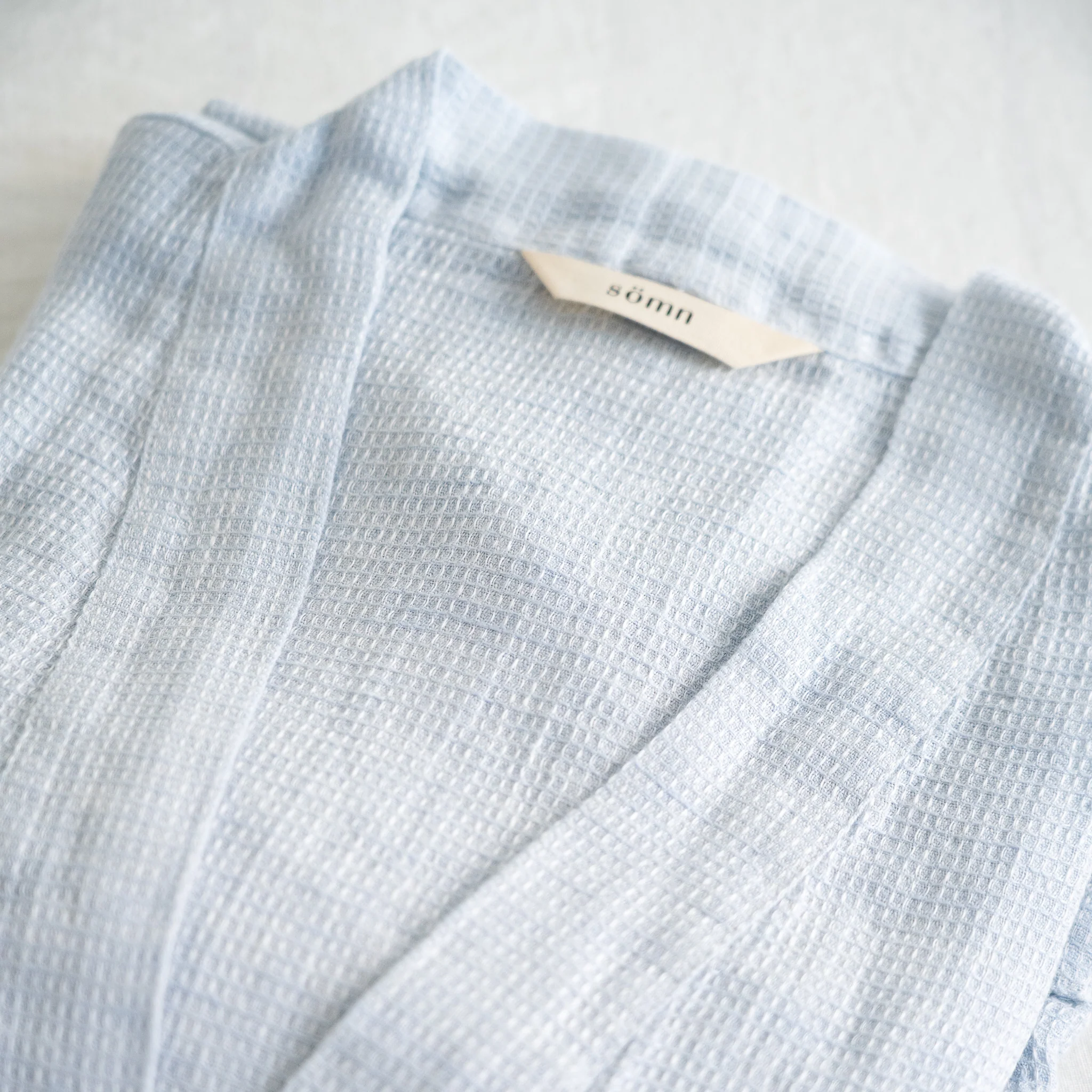 Lovingly crafted with a sumptuous waffle fabric, this linen bathrobe provides a comfortable and breathable choice for after-shower or relaxation moments. Its exquisite solid hues elevate your at-home wardrobe, while the lightweight material allows for year-round loungewear. The open front design and flexible integrated loop ensure effortless movement and ease of wear.